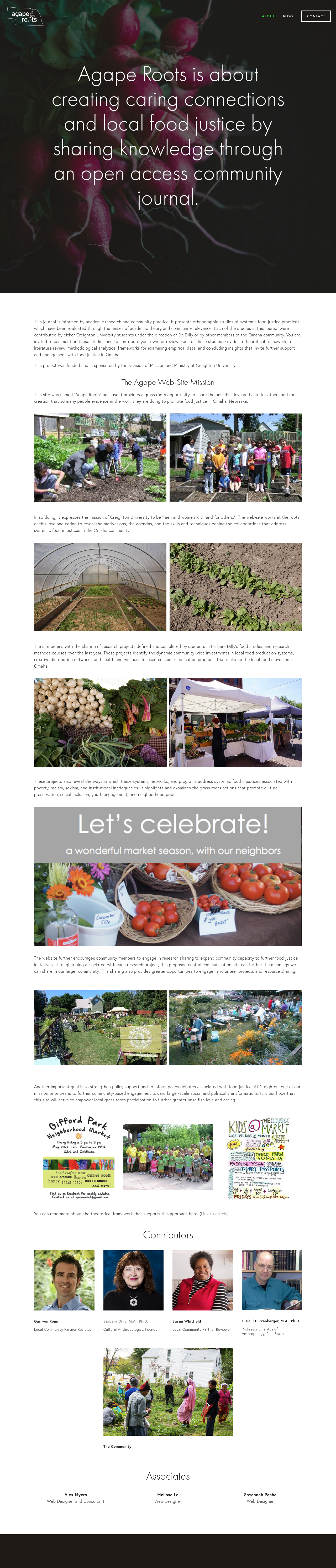 As an intern for Dr. Barbara Dilly, I helped with the ground work for Agape Roots. This is an open access journal that presents ethnographic studies of systemic food justice practices through academic theory and community relevance. Knowing that I was going to complete undergraduate school soon, I decided it would be best to create the website through Squarespace so that future students would be able to edit the site. Collaborating with the other interns, we also created a logo that would represent the local aspect(with the outline of Nebraska) and the roots(using the image of a radish). The website is currently up at www.agaperoots.com.