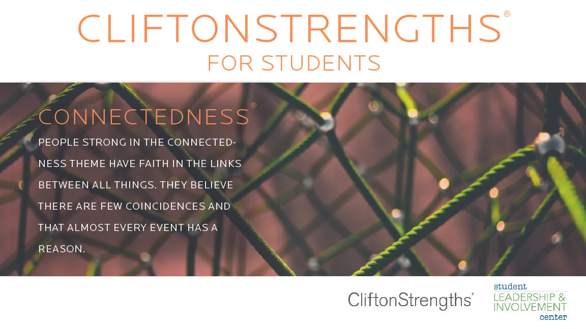 Creighton's Student Leadership and Involvement provided students the opportunity to take Gallup's CliftonStrengths® Assessment, which analyzes the results of a survey to identify the top five strengths of an individual, from a list of 34 total strengths. I created 34 digital signages to represent each strength and below are seven of the 34. For the majority of the images, I used images from www.unsplash.com.